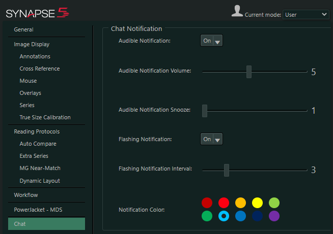 The Synapse Chat feature can be configured to display alerts from User Settings > Chats. The following settings are available: